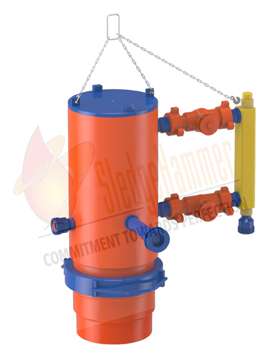 SledgeHammer's Cementing Head is designed to hold a cementing plug before it is pumped down the casing during the cementing operation. In most operations, a bottom plug is launched before the spacer or cement slurry. The top plug is released from the cement Head after the spacer fluid. A manifold incorporated into the cement head assembly allows connection of a fluid circulation line.